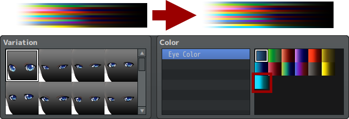 Oltre a combinare gli asset, tramite questa funzionalità puoi produrre innumerevoli elementi grafici per i tuoi personaggi e modificarne i colori.